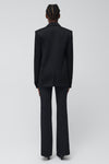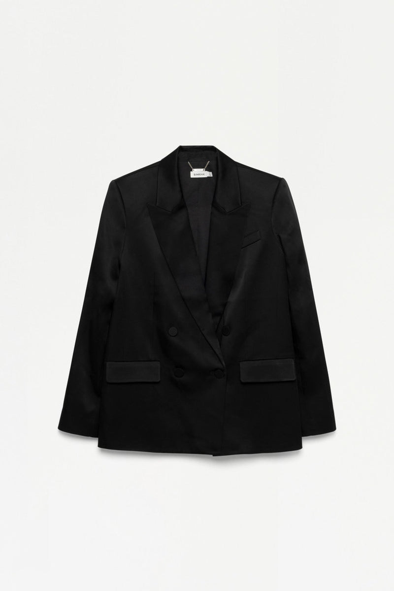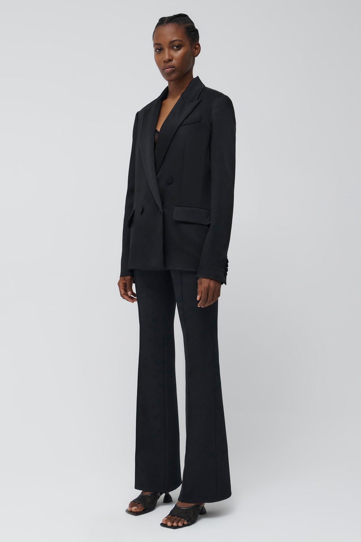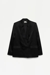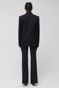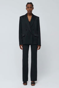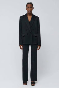 The Norah Blazer in Midnight. Elegantly tailored with a double-breasted design and crisp lapels. Its structured silhouette and refined buttons exude a timeless sophistication, making it a versatile addition to any ensemble.