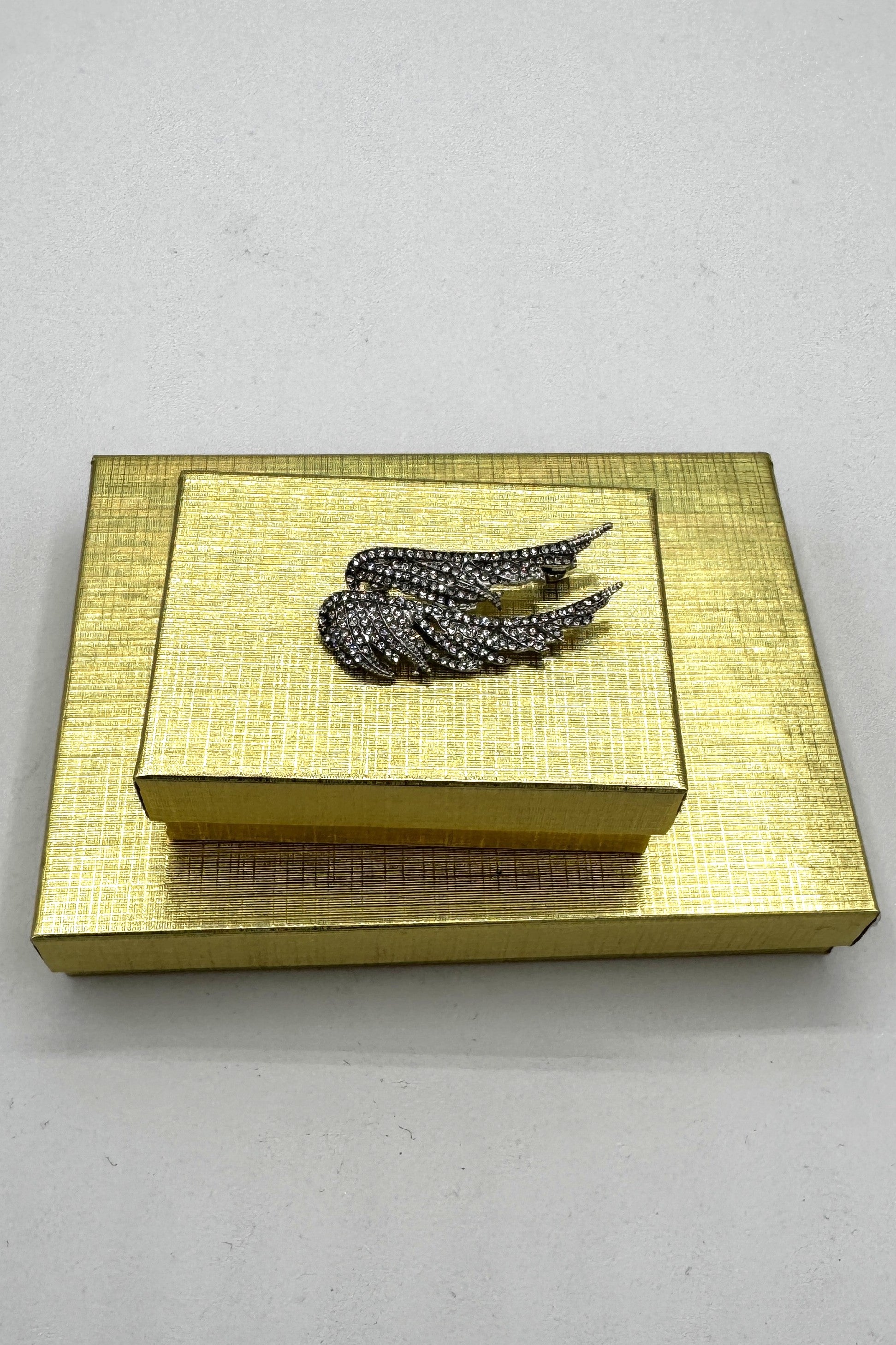 Elevate your style with the Tres Chic Angel Wings Brooch. Crafted in a silver-tone finish, this celestial design features intricately detailed wings encrusted with shimmering rhinestones. A symbol of grace and elegance, this brooch is a radiant addition to any sophisticated ensemble.