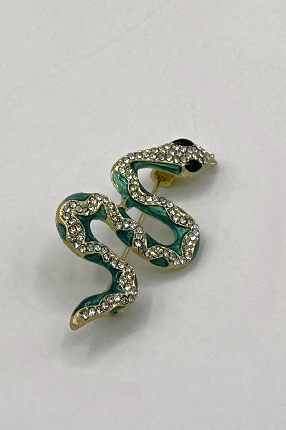 A striking statement brooch shaped as a coiled snake, detailed in a rich gold-tone finish. Its fluid silhouette is accented with emerald-green enamel and fully pavé-set crystal curves for captivating sparkle. Black crystal eyes add bold contrast, creating a dramatic, sculptural accessory with refined edge.